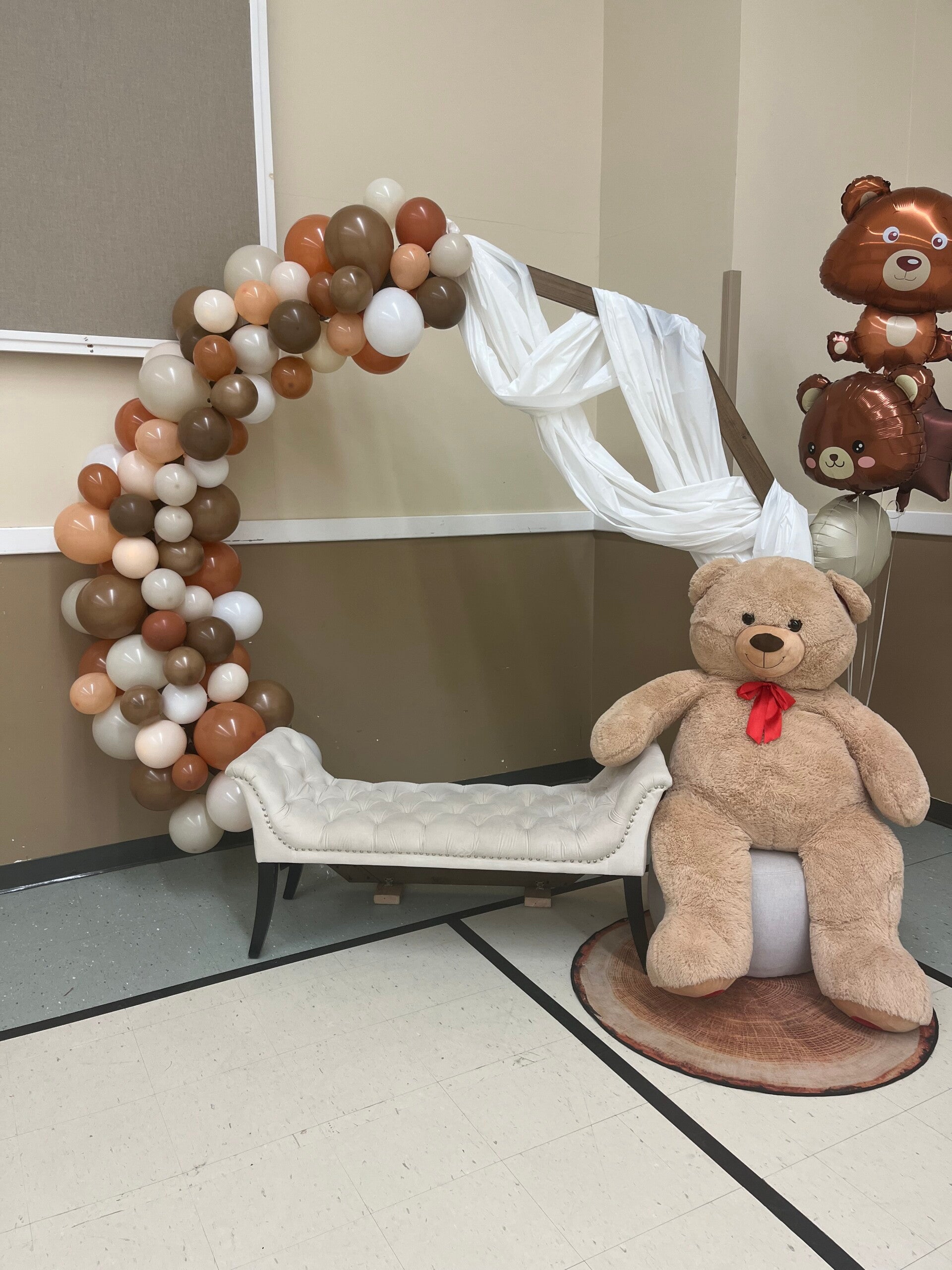 Transform your event with our arch rentals! We offer three different sizes, including a unique wooden arch and a stylish circular arch. Enhance your decorations with our big teddy bears, antique strollers, or a classic bench, perfect for baby showers and other special occasions. Our wedding flowers and centerpieces add the perfect finishing touch.